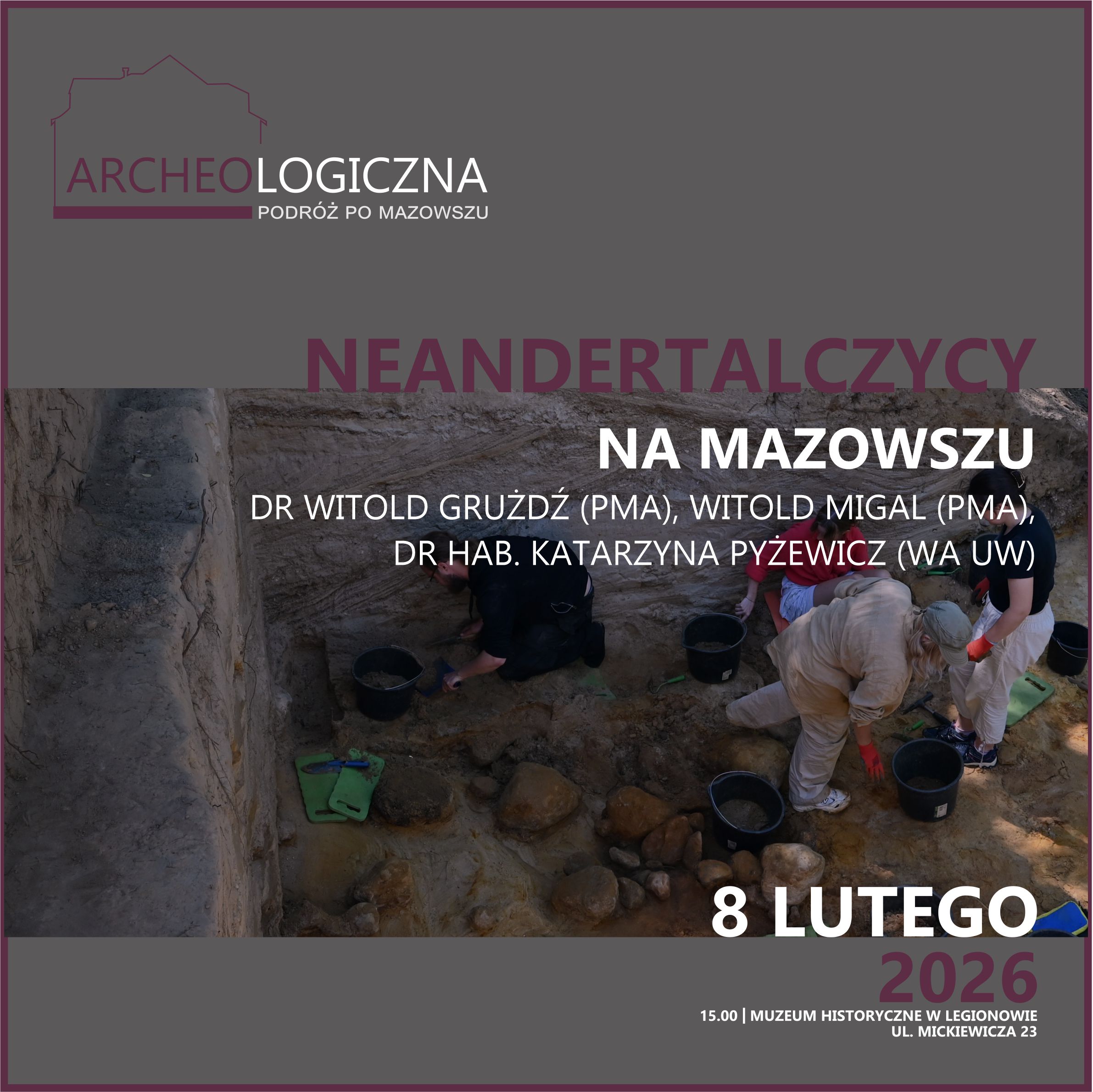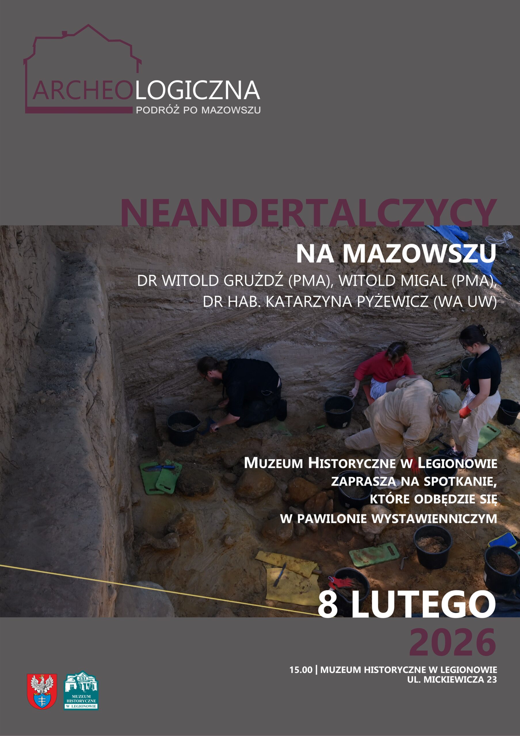 Spotkanie odbędzie się 8 lutego 2026 r. (niedziela) o godz. 15:00 w pawilonie wystawienniczym Muzeum Historycznego w Legionowie, ul. A. Mickiewicza 23. Tym razem, w ramach cyklu Archeologiczna Podróż po Mazowszu, przeniesiemy się do epoki kamienia. Nasi goście opowiedzą o zaskakujących znaleziskach wiązanych z pobytem Neandertalczyków na Mazowszu. Na ślady pozostawione przez „brata” współczesnego człowieka naukowcy natrafili podczas badań prowadzonych w okolicach Zwolenia (woj. mazowieckie). Na stanowisku odkryto narzędzia krzemienne, wśród których wyróżniono charakterystyczne noże i zgrzebła wykonane techniką obróbki kamienia typową dla Neandertalczyków. Znaleziska te datowane są na około 75–65 tys. lat temu i mogły służyć m.in. do ćwiartowania tusz dużych ssaków.