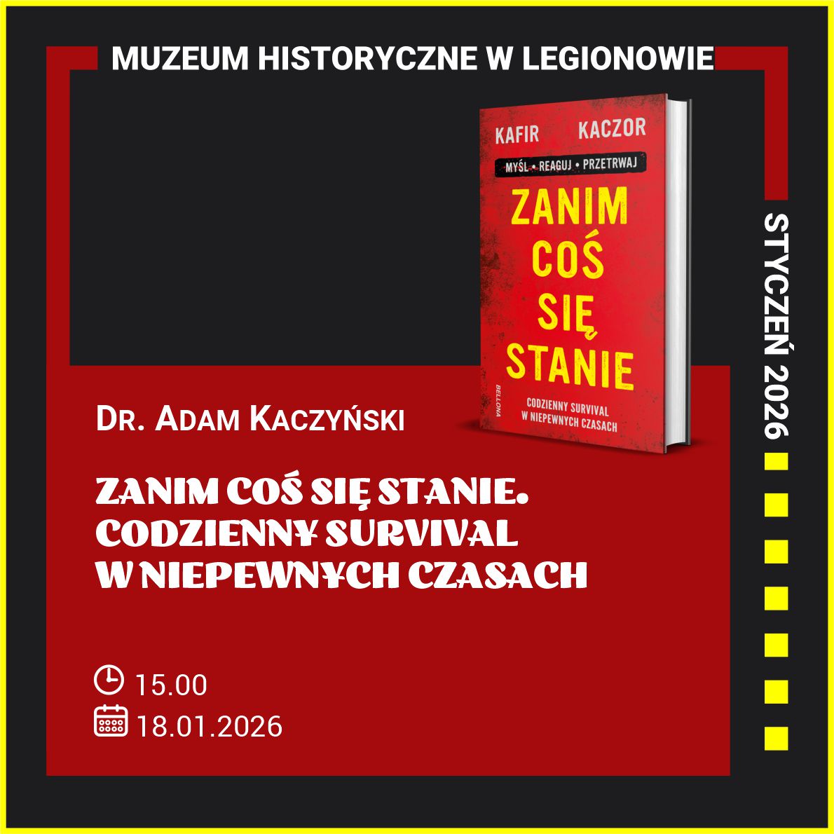 Serdecznie zapraszamy na promocję książki dr. Adama Kaczyńskiego pt. ,,Zanim coś się stanie. Codzienny survival w niepewnych czasach”.