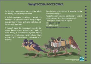 W ramach zajęć dla młodszych uczniów dostępna będzie część warsztatowa, podczas której każdy z uczestników wykona własną pocztówkę świąteczną, wykorzystując kopie archiwalnych materiałów z Muzeum oraz z Polony.