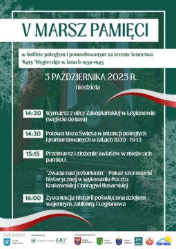 5 października 2025 r. (niedziela) odbędzie się V Marsz Pamięci w hołdzie poległym i pomordowanym na terenie leśnictwa Kąty Węgierskie w latach 1939-1945.