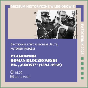 Serdecznie zapraszamy na spotkanie z Wojciechem Jeute, autorem książki Pułkownik Roman Kłoczkowski ps. ,,Grosz'' (1894-1952). Wydarzenie odbędzie się 26 października 2025 r. (niedziela) o godz. 15:00 w pawilonie Muzeum Historycznego w Legionowie, ul. A. Mickiewicza 23. Spotkanie poprowadzi Olga Gajda. Dotatkowo informujemy, że w dniu 26 października 2025 r....