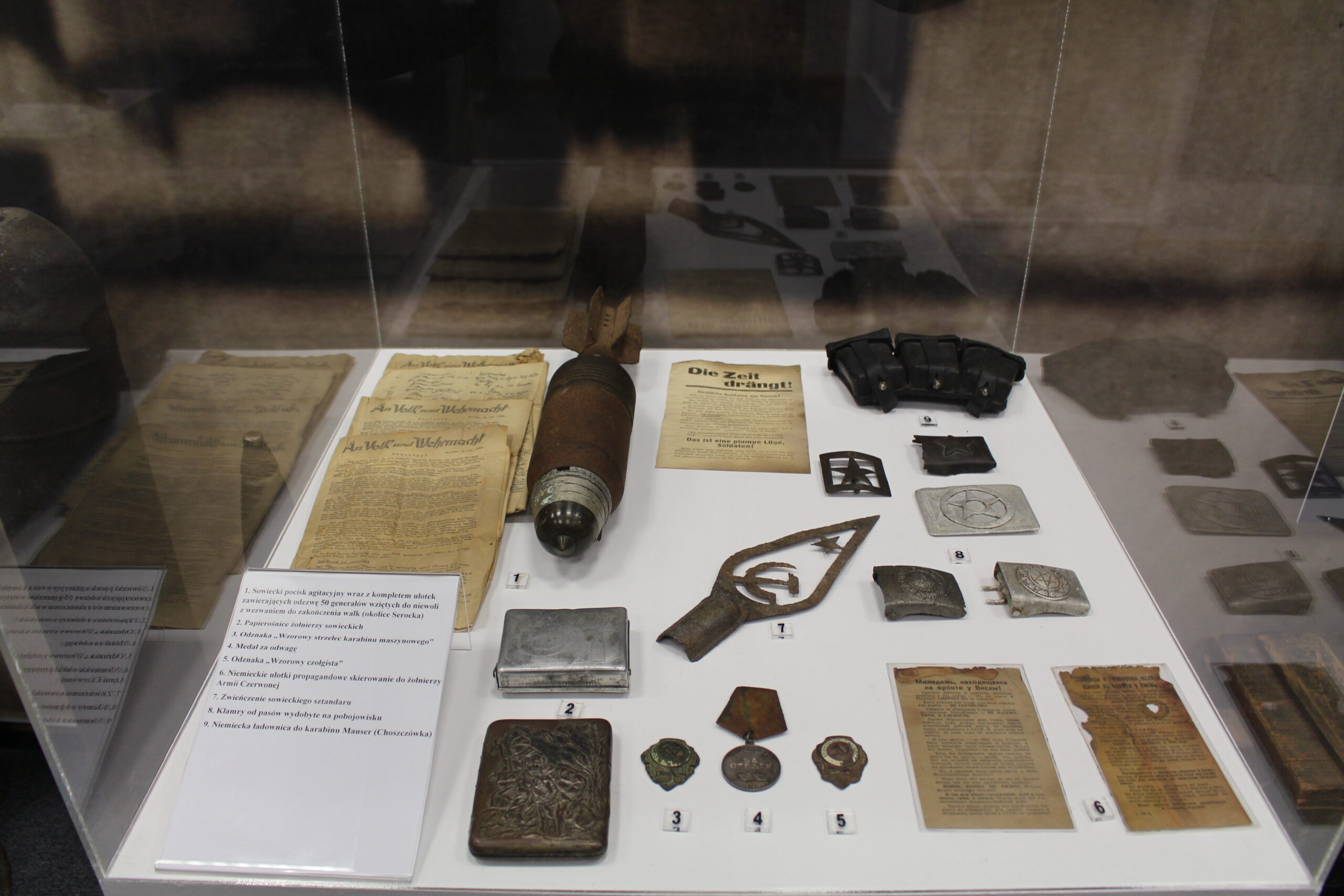Na ekspozycji zaprezentowano wiele unikatowych militariów pochodzących z pobojowisk wokół miasta. Miłośnicy historii wojskowości odnajdą tu min. będący rzadkością sowiecki pocisk agitacyjny z zachowanym kompletem ulotek z grudnia 1944 r., oryginalny hełm i orzełek wz. 43 odnaleziony w miejscu walk 1. Dywizji Piechoty im. Tadeusza Kościuszki pod Buchnikiem oraz kilkadziesiąt typów granatów i pocisków, włącznie z bombą lotniczą FAB-100 i wyrzutnią Panzerschreck.